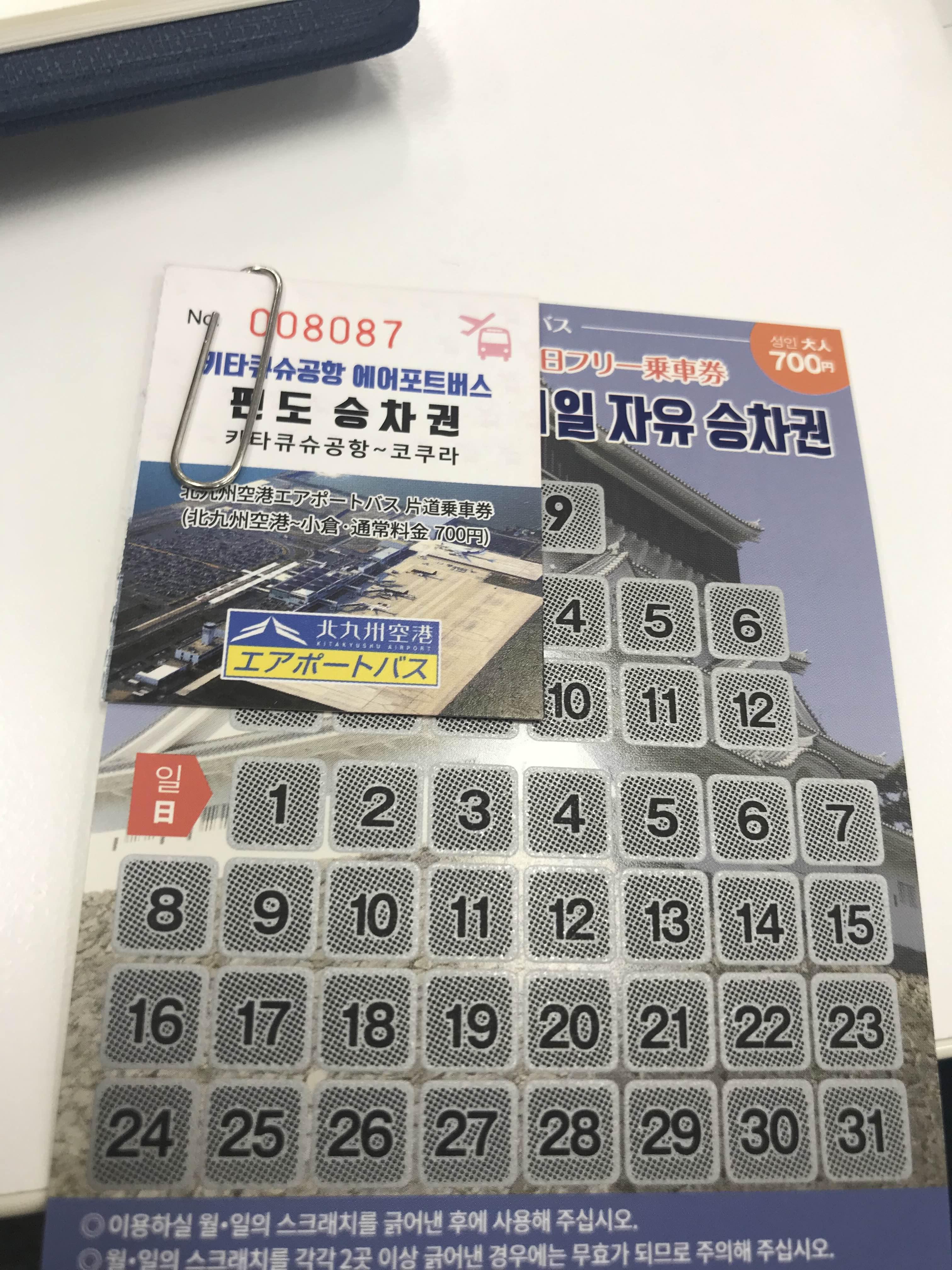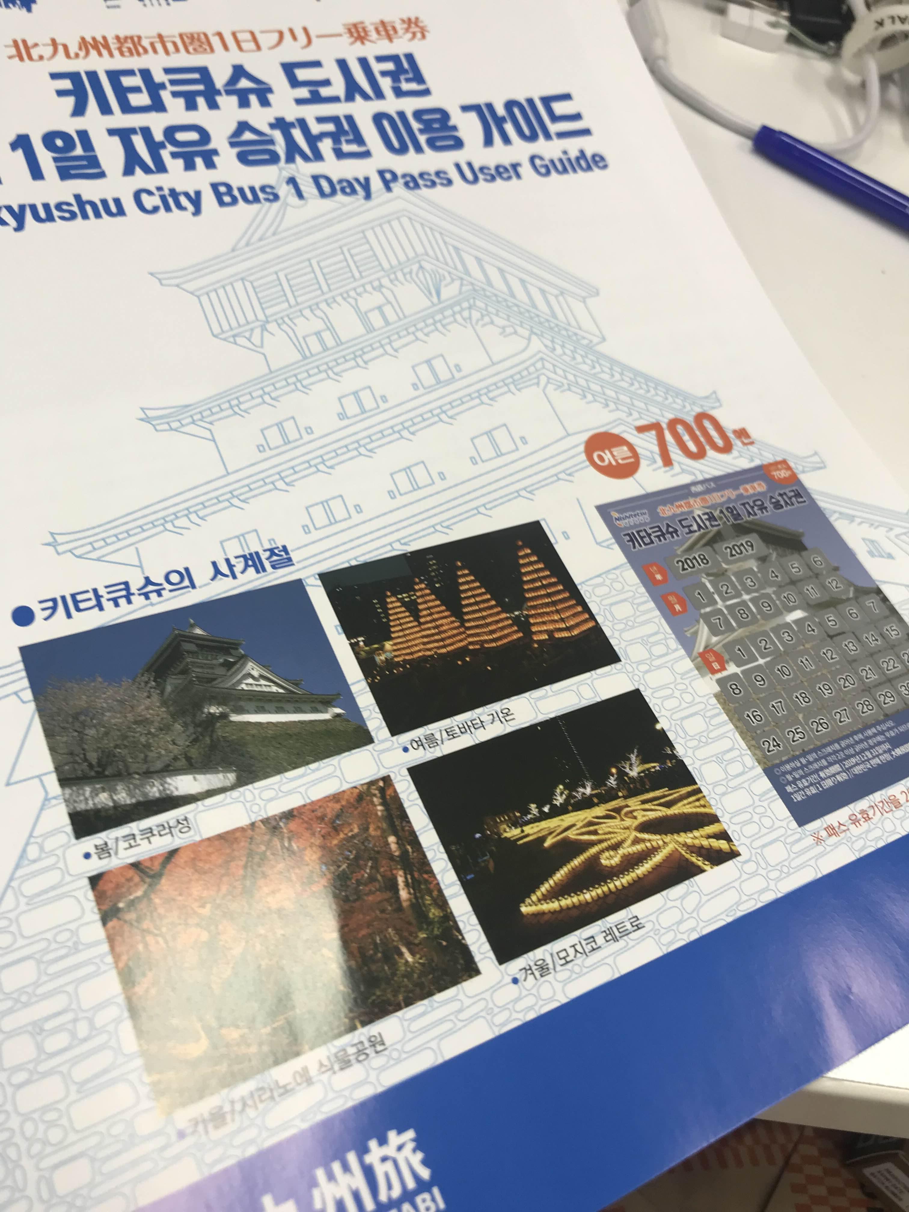 3. 저렴한 교통비: 키타큐슈 역시 일본의 다른 지역과 같이 관광객을 위한 다양한 교통패스를 판매하고 있는데, 당시 1일 버스권이 700엔이였다. 키타큐슈에서 공항까지 가는 버스 편도 가격(현재 710엔)을 감안할 때, 저 패스만 있으면 키타큐슈안에서도 최대한 덜 걸으면서 여행할 수 있었다. 특히, 내 당일치기 스케줄에서 필수적인 목욕탕(큰 목욕탕) 방문을 위해서는 시내버스 탑승이 절대적으로 필요했기 때문에, 마이리얼트립에서 버스패스를 미리 구매해서 갔다. 현재는 이 버스패스가 없지만, 곧 다시 생길것으로 보인다. 근데 또 웃긴건 국제선 승객한테는 공항버스 편도 요금을 받지 않았다는 것..