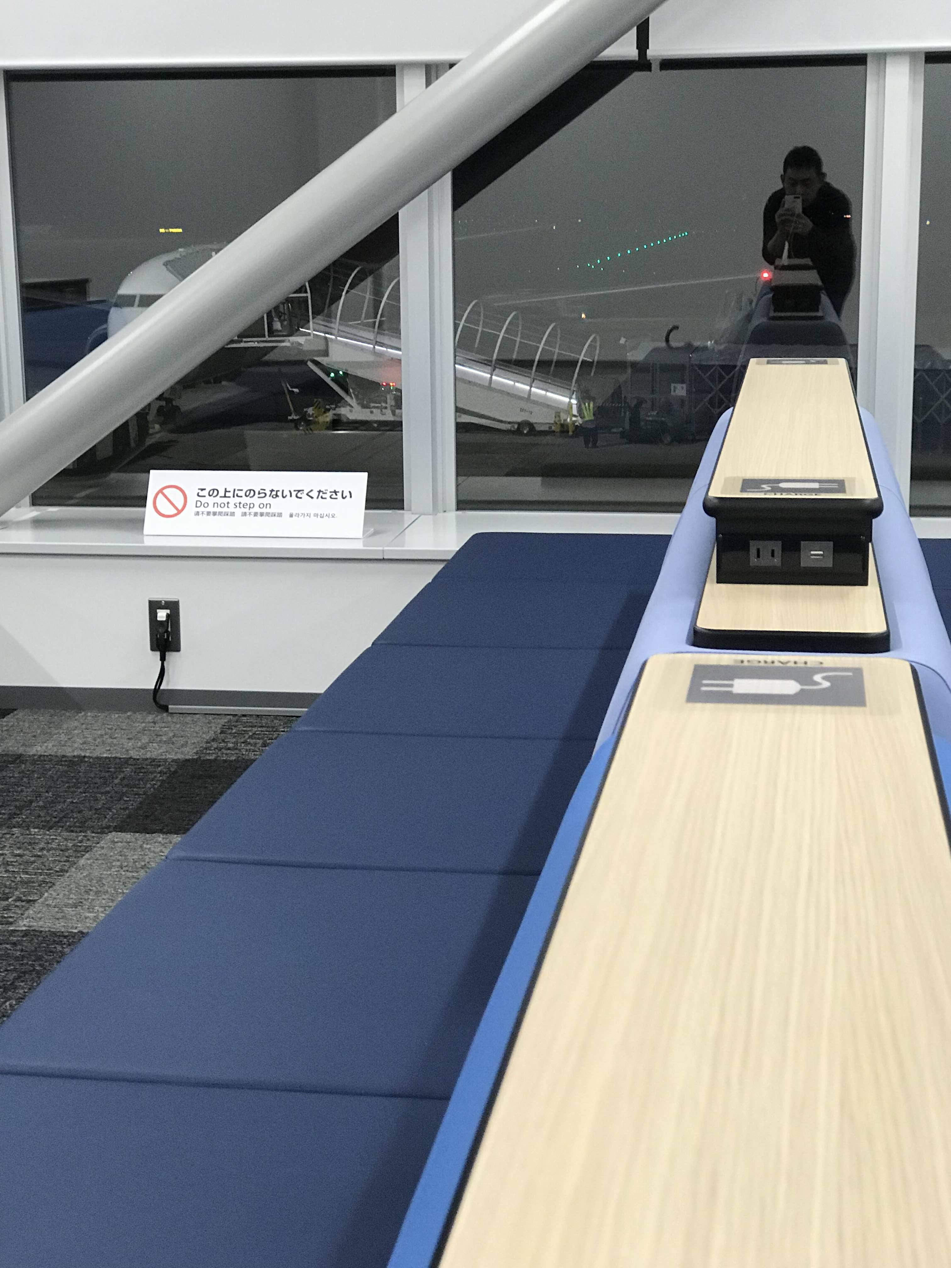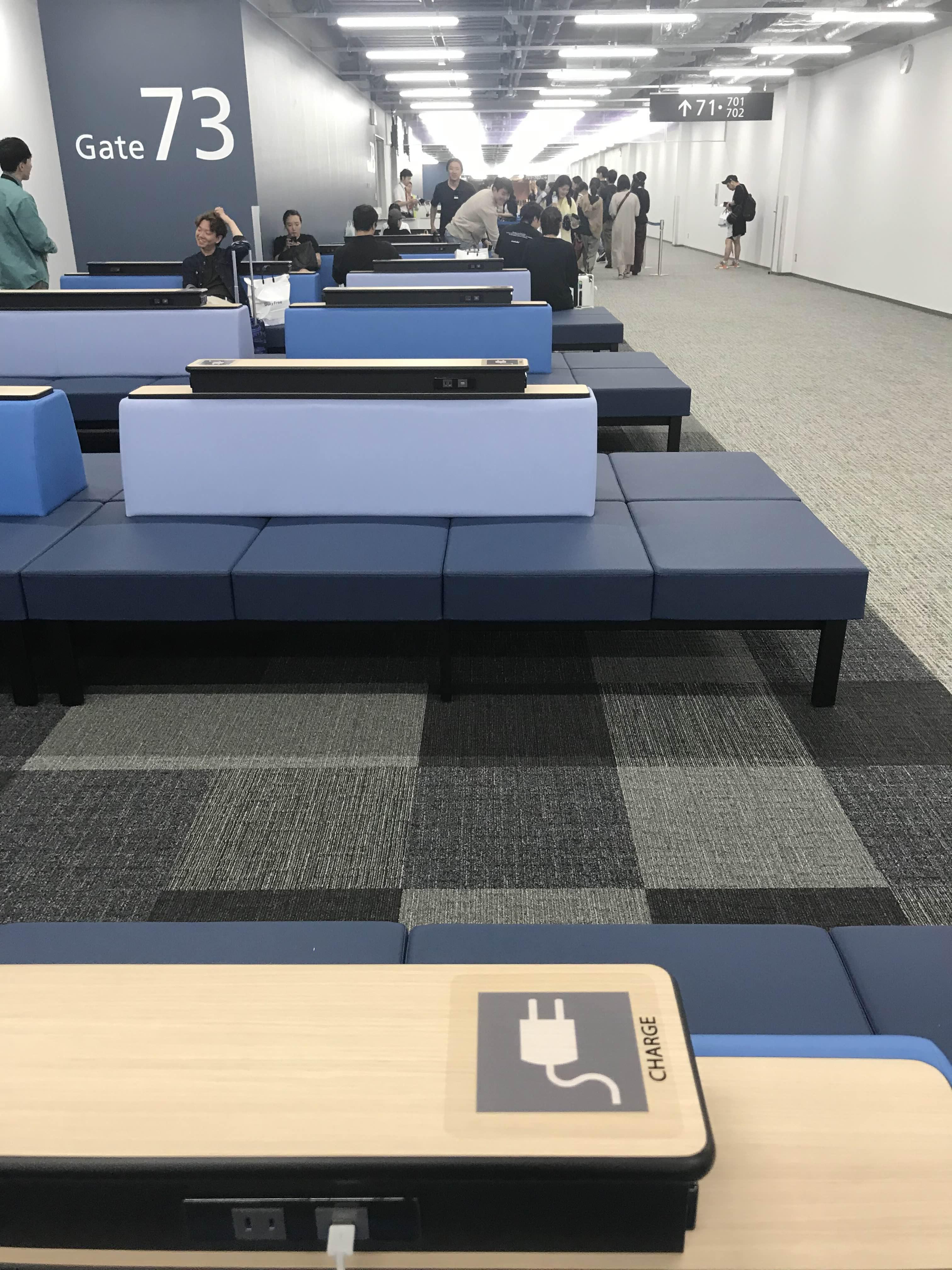 (1955) 출국장 이동: 2터미널 출국장으로 이동한다. 나리타, 간사이 1터미널을 제외한 일본 대다수의 국제공항들의 출국장 내부에는 식당 쇼핑 시설이 별로 없기 때문에 가능하면 최대한 밖에서 시간을 보내다 들어가는것이 현명하다. 일본 내 국내선도 마찬가지다. 문화 자체가 최대한 출국장 들어가기전에 가족들과 함께 시간을 최대한 보내다가 비행기를 타러 가는 구조이기 때문에 보안검색을 일찍 종료한다거나.. 그런 일이 없다고 보면 된다. 2터미널은 동선도 작아서 게이트까지 걸어가는데 5분이 채 걸리지 않았다.