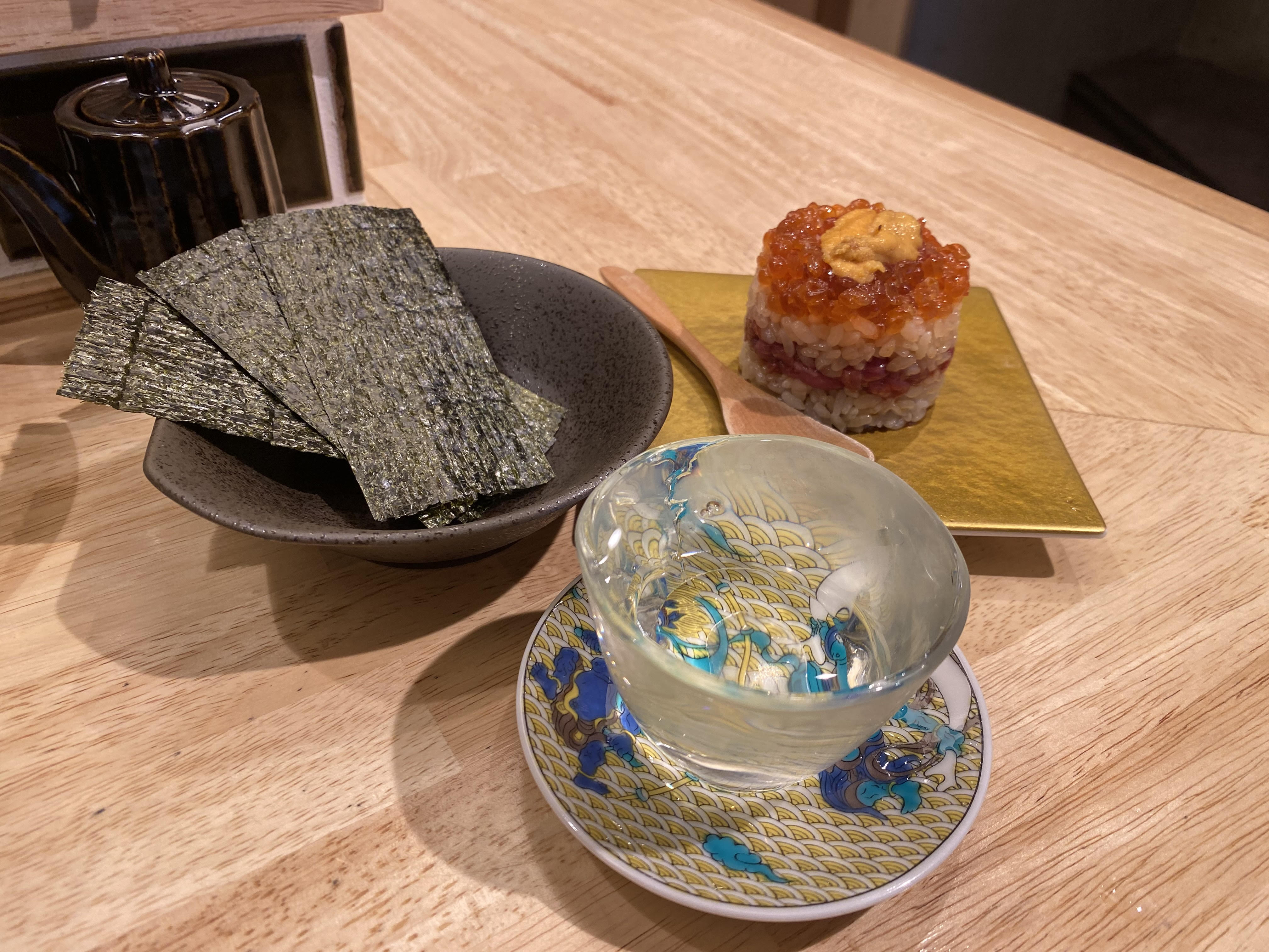 왼쪽부터 생새우연어알메추리알 비벼서 게장마끼에 올려먹는 요리, 육회연어알성게알 스시? 생새우튀김(감태가루)