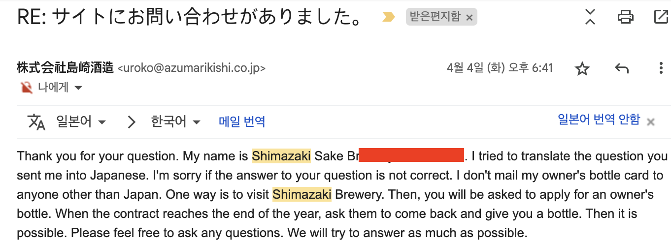 무슨 이야기인가 하면... 저 양조장에서 제공하는 숙성 사케 서비스(Owner's Bottle)가 원래는 일본 내부에 주소가 있는 사람들에게만 제공되는 서비스이기 때문에... 국외에서 방문하는 입장에서는 막상 갔는데 퇴짜를 맞을 수 있는 가능성이 존재할 수 밖에 없었다.