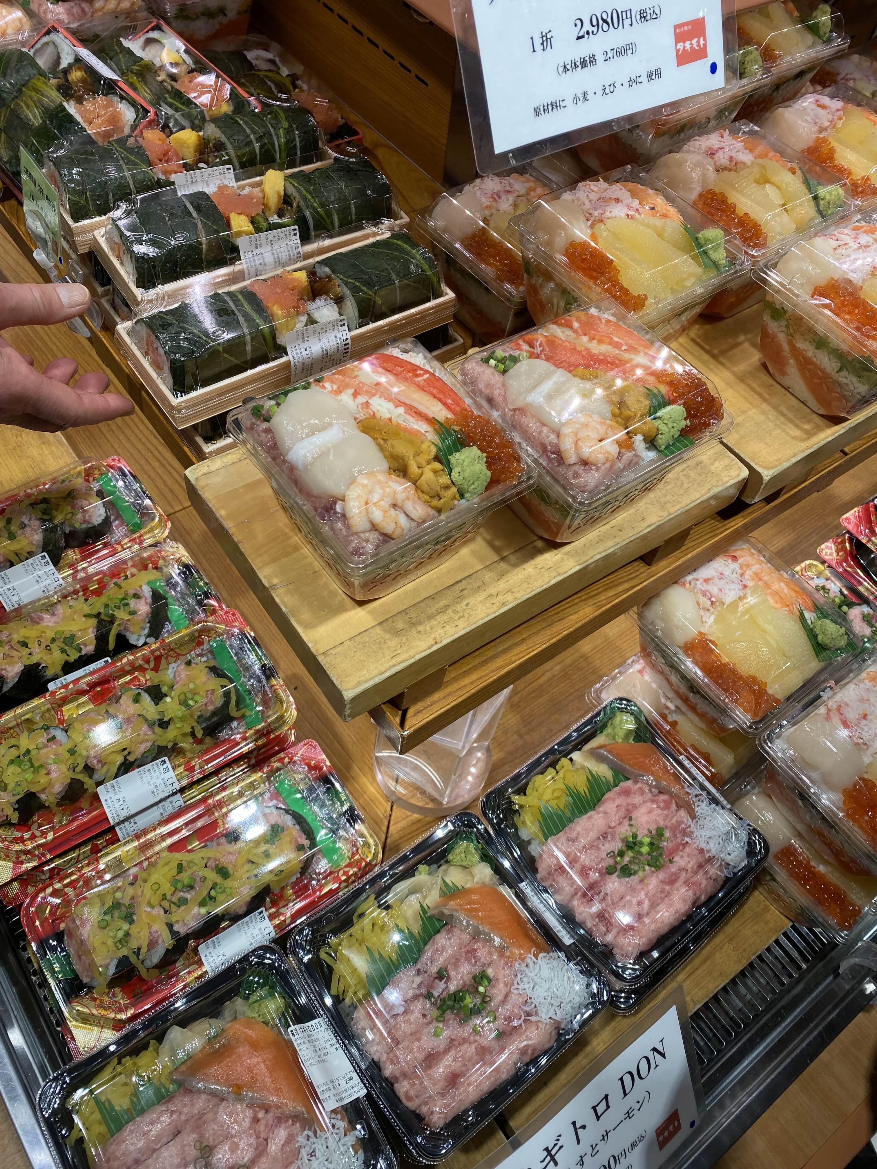 | 저녁 | 다이마루 식품관 털이 (고등어봉초밥, 카이센동, 샴페인 구매) |